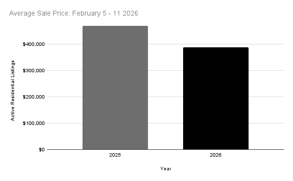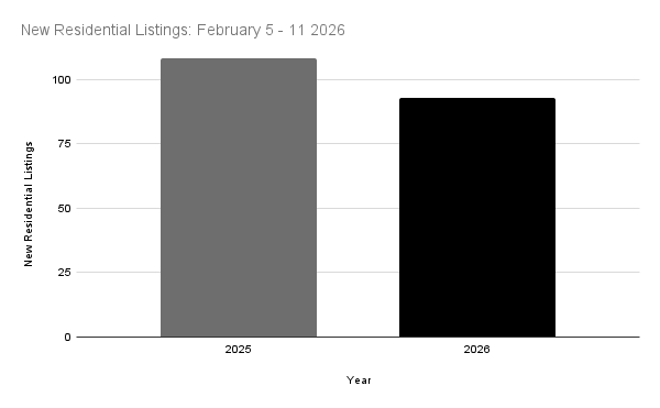 Sales activity eased this week, with 56 residential sales recorded compared to 78 during the same period last year. This represents one of the softer weekly sales totals so far this winter and suggests buyers are continuing to move selectively as new inventory comes to market.