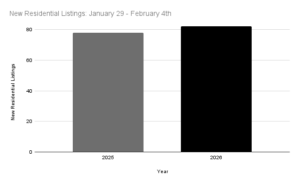Sales activity softened slightly during the first week of February, with 72 residential sales compared to 77 during the same period last year. The change is modest and consistent with the measured pace of early-year market activity.